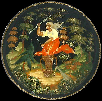 La barque est un symbole de voyage: elle transporte les morts dans l’au-delà dans de nombreuses civilisations (la barque du soleil Râ et des morts chez les Égyptiens, la barque qui traverse le fleuve Styx chez les Grecs...); la barque est aussi un berceau et évoque la matrice et la sécurité maternelle; mais ici, la sorcière est le maternel destructeur et l’utilise pour enlever les enfants et les mener à la mort.