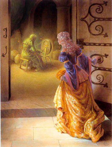 Arriva le jour de ses quinze ans: il se trouva que le roi et la reine s’absentèrent du château où la princesse resta seule. Elle alla çà et là, visitant les chambres, les galeries et les salons selon sa fantaisie. Sa promenade la conduisit dans une très vieille tour. Elle monta les marches en colimaçon et arriva devant une petite porte. Dans la serrure, il y avait une vieille clef rouillée et lorsqu’elle la tourna, la porte s’ouvrit sur une vieille femme assise dans une pièce minuscule qui filait avec application son lin.