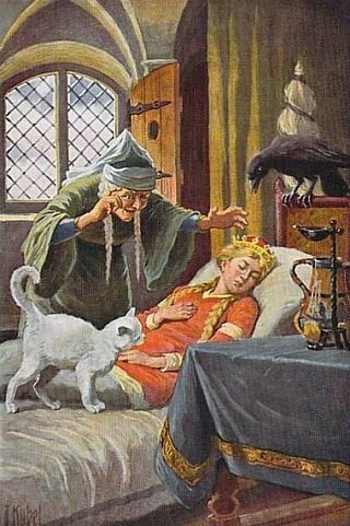 Lorsque la onzième eut prononcé son offrande, entra brusquement la treizième. Elle voulait se venger de n’avoir pas été invitée, et sans saluer ni regarder personne, elle prononça d’une voix puissante: "La fille du roi se piquera avec un fuseau lorsqu’elle aura 15 ans et en tombera morte." Et sans un mot de plus, elle quitta la salle.