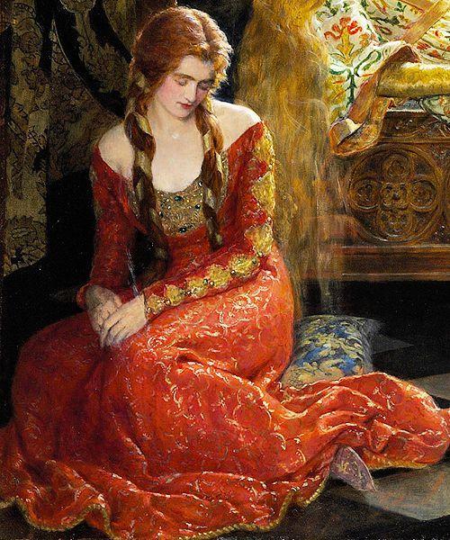 L’ange entra alors dans la chambre où se tenait la reine avec son fils qu’elle avait l’habitude d’appeler "Riche-en-Douleurs", et il lui dit: "Viens avec ton enfant, ton mari est là." Elle alla dans sa chambre et le mouchoir tomba par terre.