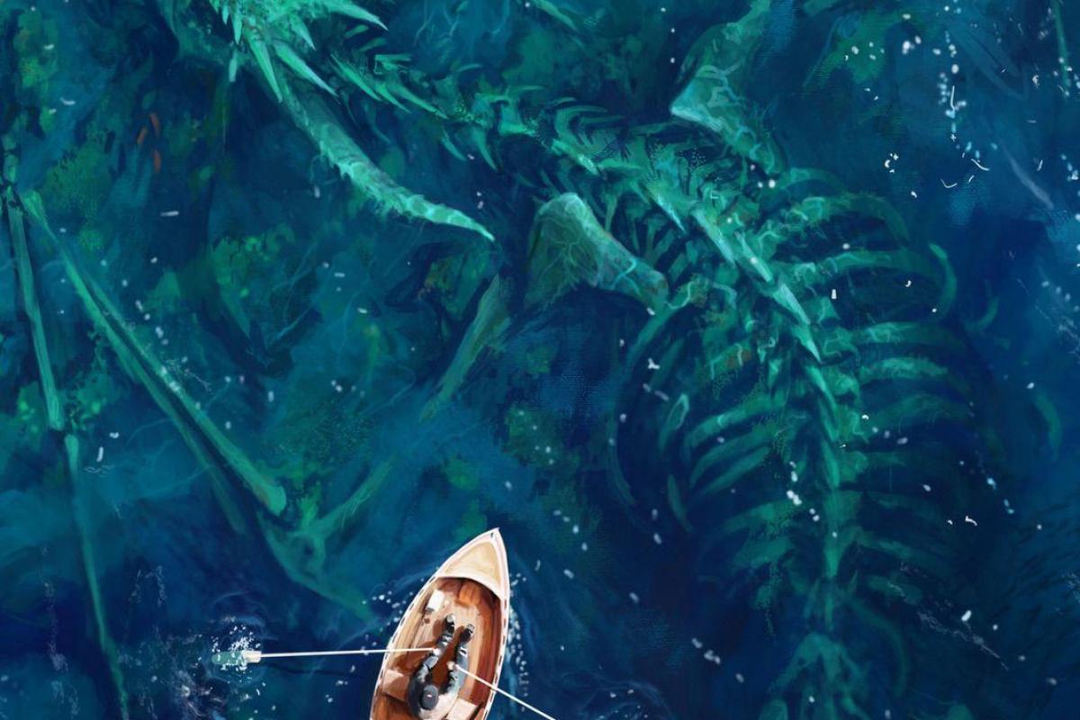 Or, voilà que le hameçon du pêcheur se prit dans les os du squelette de la femme. "Oh, se dit-il, je tiens là une belle prise!" Tandis qu’il se battait avec ce poids énorme, la mer se mit à bouillonner, secouant son kayak, car la femme squelette se débattait pour tenter de se libérer. Plus elle luttait, plus elle s’emmêlait dans la ligne. S’étant retourné pour rassembler son filet, le pêcheur ne vit donc pas son crâne chauve apparaître, ni les petites créatures coralliennes qui scintillaient dans ses orbites, ni les crustacés sur ses vieilles dents d’ivoire.