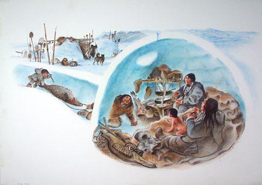 Dans son igloo, se sentant enfin en sécurité, le pêcheur remercie dieu, sous la forme du corbeau et de la déesse Sedna.