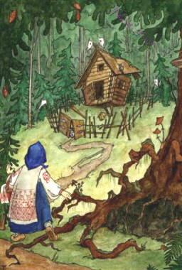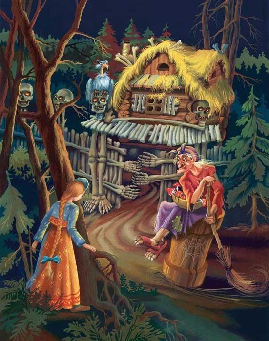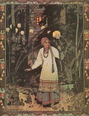 Effrayée, Wassillissa mit la poupée dans sa poche, sortit de la maison et entra dans la forêt. Après quelque temps, elle croisa un homme habillé de blanc, monté sur un cheval blanc: le ciel s’éclaircit. Puis un cavalier rouge apparut: le soleil se leva. Wassillissa marcha encore tout une journée. Vers le soir, elle parvint à une barrière entourant une hutte en ossements humains, au toit était décoré de crânes, les portes faites de tibias et le loquet d’un bras humain; en guise de serrure, il y avait une mâchoire ricanante.