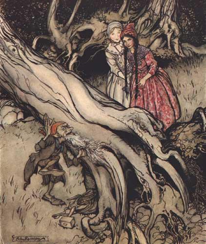 Les fillettes se donnèrent beaucoup de peine sans parvenir à dégager la barbe, tellement elle était fermement pincée. "Je vais courir chercher de l’aide, dit Roserouge. - Têtes de moutons folles, glapit le nain, aller chercher encore du monde alors qu’à vous deux c’en est déjà autant de trop! C’est tout ce que vous trouvez? - Ne t’impatiente pas, je sais ce que nous allons faire", lui dit Neigeblanche. Elle prit ses petits ciseaux dans sa poche et coupa la pointe de la barbe. Sitôt libre, le nain attrapa son sac entre les racines de l’arbre qui était plein d’or, le souleva et partit en grommelant: "Peuple de rustres! Me couper un bout de ma fière barbe. Que le coucou vous le rende!" Il jeta son sac sur son dos et s’en alla sans un regard aux deux fillettes.