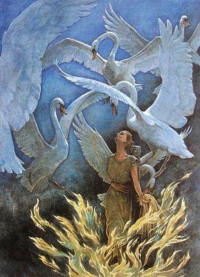 Ayant apporté sur le bûcher les six chemises de fleurs d’étoiles, la jeune reine les jeta aussitôt sur eux. Dès que les chemisettes touchèrent leurs corps, les plumes tombèrent et les six frères se tinrent devant elle en jeunes hommes vigoureux et beaux. Seul le cadet garda une aile de cygne en guise de bras gauche parce que sa sœur n’avait pu terminer la manche gauche de sa chemise.