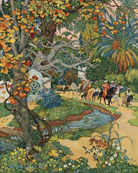 Après avoir marché trois jours et trois nuits, il aperçut un vaste bâtiment entouré d’un grand jardin, dont le portail était ouvert. Il entra, et voilà que l’ensemble disparut soudainement. Se retournant pour quitter ce lieu, il ne vit plus trace de porte. Mais le jardin réapparut miraculeusement et il entreprit de le visiter. Il y poussait toutes sortes d’arbres couverts de fruits et de fleurs aux couleurs éclatantes. Ayant faim, il cueillit des fruits, mais il eut beau en manger en grande quantité, il ne parvint pas à être rassasié.