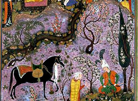 Hâtim reprit donc la route dans la direction indiquée, en devisant avec les compagnons que le roi lui avait procurés. Après vingt jours de chevauchée, il aperçut un objet étrange qui ressemblait au sommet arrondi d’une montagne. Ses compagnons lui dirent que c’était l’entrée du bain Bâdguerd qu’ils atteindront en sept jours et sept nuits de voyage. Puis ils rencontrèrent le gardien du bain qui, à la tête de son armée, en refusait l’entrée à quiconque n’avait pas un permis du roi.