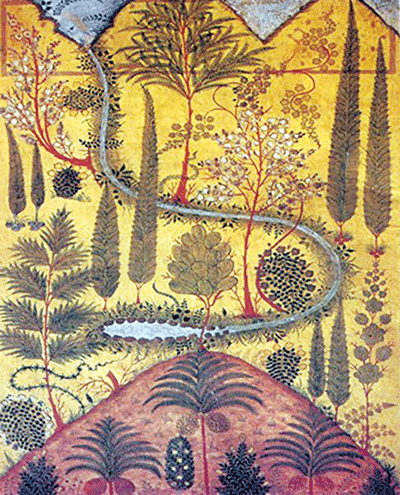 Une inscription y était gravée: "Ce lieu enchanté, construit du temps du roi Gayomard, restera longtemps un signe, et quiconque tombera sous son ensorcellement n’en réchappera pas vivant; la stupeur et l’horreur seront son lot. Il souffrira de la faim et de la soif, bien que pouvant manger de tous les fruits du jardin aussi longtemps qu’il demeurera en vie; il lui sera possible de contempler tout ce qu’on peut voir en cet endroit, mais il lui sera très difficile d’en ressortir."