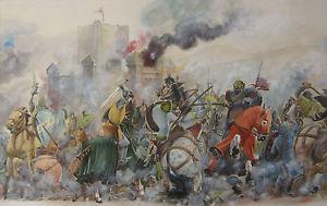 Sur ce, l’homme sauvage rentra dans la forêt et peu après, un palefrenier amena un coursier qui soufflait bruyamment par les naseaux et se laissait à peine maîtriser. Et derrière, suivait une troupe de soldats tous bardés de fer, leurs épées étincelant au soleil. Enfourchant le coursier, le jeune homme prit la tête de la troupe. Quand il approcha du champ de bataille, une grande partie des gens du roi étaient tombés. Alors le jeune homme s’élança avec sa troupe de fer, fondit comme l’orage sur les ennemis et abattit tout ce qui lui résistait. Il ne les lâcha que lorsqu’il ne leur resta plus un seul homme.