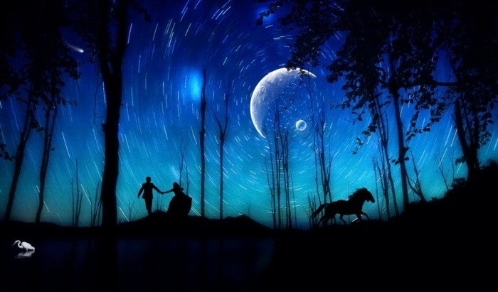Le cheval blanc dit à son cavalier: "Retourne-toi, que vois-tu ? - Un point noir dans le ciel, plus noir que la nuit, d'où jaillissent des éclairs de feu. - Malheur à nous! C'est mon père. Si maintenant tu ne fais pas fidèlement ce que je te dis, ce sera notre perte. Je vais me transformer en une grande mare de lait et toi en canard. En nageant, tiens-toi toujours bien au milieu, la tête cachée. Qu’aucune séduction ne t'induise à sortir la tête du lait ou à t'approcher de la rive!"