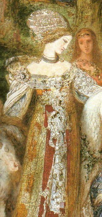 Là elle entendit dire qu’il y aurait bientôt une fête pendant laquelle ils célébreraient leurs noces. Alors elle dit: 'Dieu me vienne encore en aide." et elle ouvrit le petit coffret que le soleil lui avait donné, et dedans il y avait une robe aussi brillante que le soleil lui-même. Elle la sortit, s’en revêtit et se rendit au château, et tous les gens et la fiancée elle-même la regardèrent avec étonnement.