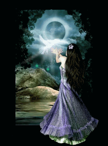 Alors elle lui demanda: "Toi qui brilles toute la nuit sur tous les prés et les bois, n’as-tu pas vu voler un pigeon blanc? – Non, dit la lune, je n’en ai pas vu, mais je te fais cadeau de cet œuf, casse-le si tu te trouves en grand péril."