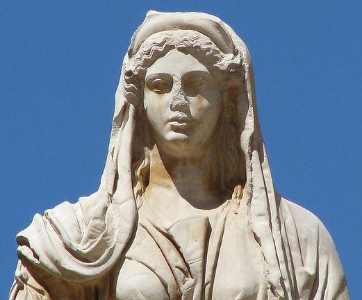 Quittant l'Olympe, elle se déguisa pour descendre sur terre, afin qu’on ne la reconnût point. C’est ainsi qu’elle arriva à Éleusis. Elle s’assit sur une pierre, au bord de la route, semblable à une vieille femme misérable, elle, la radieuse!